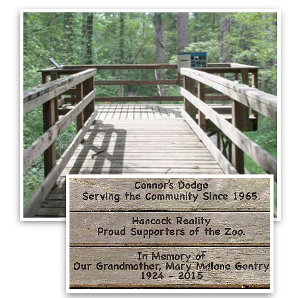 Join our “walk on the wild side”. . . Over 3,000 feet of wood decking and bridge walkways will wind their way through the entire zoo. Your personalized deck board will be seen by millions of zoo-goers, year after year. Whether it’s to commemorate a loved one, or a way for your business, group, or organization to show its support, an engraved board will contribute toward our efforts to Build Your Zoo.